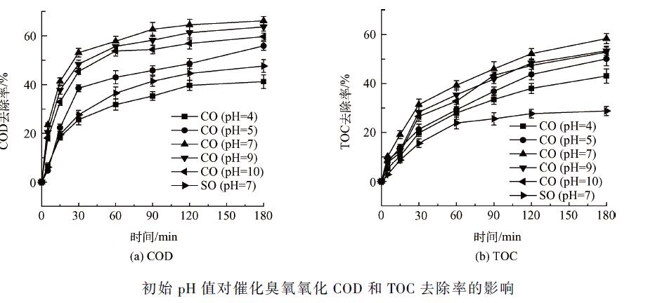 由圖1可知,催化臭氧氧化(catalytic ozonation,CO)的COD 去除率可以達到(66. 2 ± 1. 7)% ,比單獨臭氧氧化(single ozonation,SO) 的(47. 6 ± 2. 6)% 提高了近20 個百分點;而TOC 去除率則可以達到(58. 4 ± 2. 1)% ,比單獨臭氧氧化的(28. 8 ± 1. 9)% 提高了近1 倍。調(diào)節(jié)廢水pH 值,無論是酸性(pH = 4,5),還是堿性(pH = 9,10),催化臭氧氧化的效果都不如中性(pH = 7)的效果好,這可能是因為羥基氧化鐵的零電荷點(pHpzc )在中性附近,過酸和過堿都影響了羥基氧化鐵表面羥基的電荷形態(tài)。需要注意的是:當pH = 4 時,COD 的去除率不如單獨氧化的,但TOC 的去除率卻比單獨氧化的高。這是因為單獨臭氧氧化很難降解煤化工生化出水中的難降解有機物,從而TOC去除率低;而pH = 4 時催化臭氧氧化一定程度上降解了這部分難降解有機物,甚至是難以測出COD 的有機物,但效果沒有中性和堿性條件下的好,依然有一部分降解不完全,反而被檢測出COD,從而COD 的去除率反而降低。