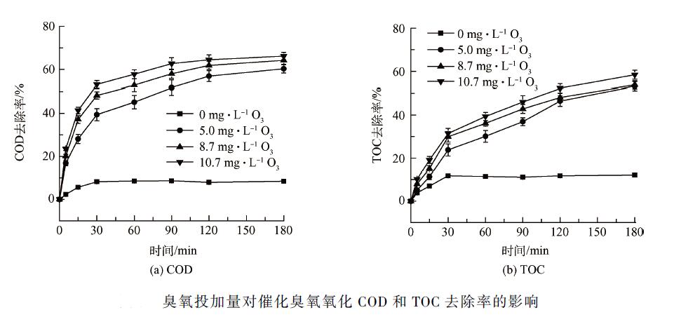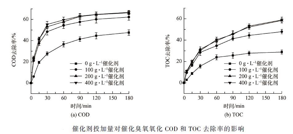 臭氧是有機物降解的直接動力,其投加量直接影響催化臭氧氧化的速率及效果。實驗通過調(diào)節(jié)所用臭氧發(fā)生器電流檔位改變臭氧投加量,并用碘量法測出臭氧產(chǎn)生量。廢水不調(diào)節(jié)pH 值(中性),催化劑投加量為200 g·L - 1 。由圖3 可知,不通臭氧,單純通空氣時,催化劑對廢水只有吸附作用,此時COD 和TOC 的去除率僅有(8. 6 ± 0. 3)% 和(12. 1 ± 0. 4)% 。增大臭氧投加量對COD 和TOC 的去除率的提有限,這可能與臭氧的利用率有關,有效利用的臭氧較少,但增大臭氧投加量,有利于三相界面的傳質(zhì),反應速率更快,特別是在短時間內(nèi)效果顯著。