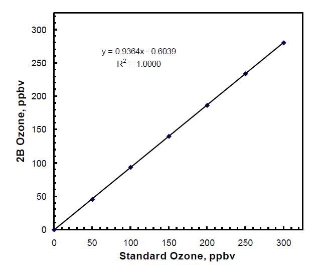 在本例中,校準(zhǔn)參數(shù) S 為 1/0.9364 = 1.068,四舍五入為 1.07。該圖的 y 截距,即方程 y = mx + b 中的 b,在上例中為 -0.6,應(yīng)在臭氧校準(zhǔn)源設(shè)置為零時(shí)測量的偏移的 ±2 ppb 范圍內(nèi)。如果不是,則儀器可能存在問題。通常,這表明臭氧監(jiān)測器流路中存在污染。