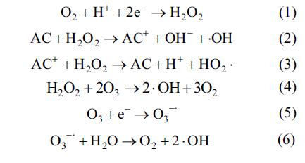 但是常見的二維電極體系,存在電極比表面積小,污染物的降解受傳質(zhì)限制,處理時(shí)間長(zhǎng),電流效率低等缺點(diǎn).在二維電極間填充活性炭、金屬氧化物等多孔顆粒材料作為粒子電極,可構(gòu)成三維電極(3D)體系.利用多孔材料的高比面積和吸附能力,可顯著強(qiáng)化污染物的傳質(zhì).此外,粒子電極上發(fā)生的一系列催化反應(yīng),如O2 電化學(xué)還原為H2O2(式(1))、H2O2被催化分解產(chǎn)生•OH(式(2)、(3))等,可有效強(qiáng)化系統(tǒng)的氧化能力.在相同的電流條件下,三維電極體系可比二維電極體系提高10%~50%的COD去除率.