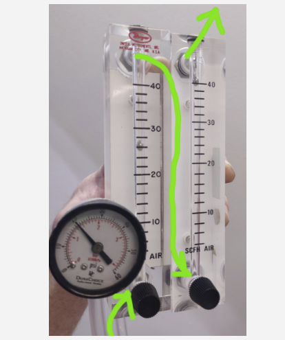 當(dāng)氣體,無論是空氣還是氧氣,通過流量計加壓時,流量計將讀取不準(zhǔn)確的流量。下圖顯示了兩個相同的流量計并排,從氧氣濃縮器流過每個流量計的氧氣量相同。左邊的流量計壓力為20 psi,右邊的流量計壓力為0 psi。盡管流經(jīng)流量計的氧氣量是相同的,但流量讀數(shù)是不同的。在壓力下,流量計的讀數(shù)將低于實(shí)際流量。