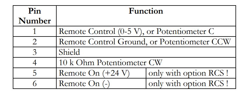 可選的儀器可以訂購(gòu)6針遙控連接器(綠色),而不是電位器。